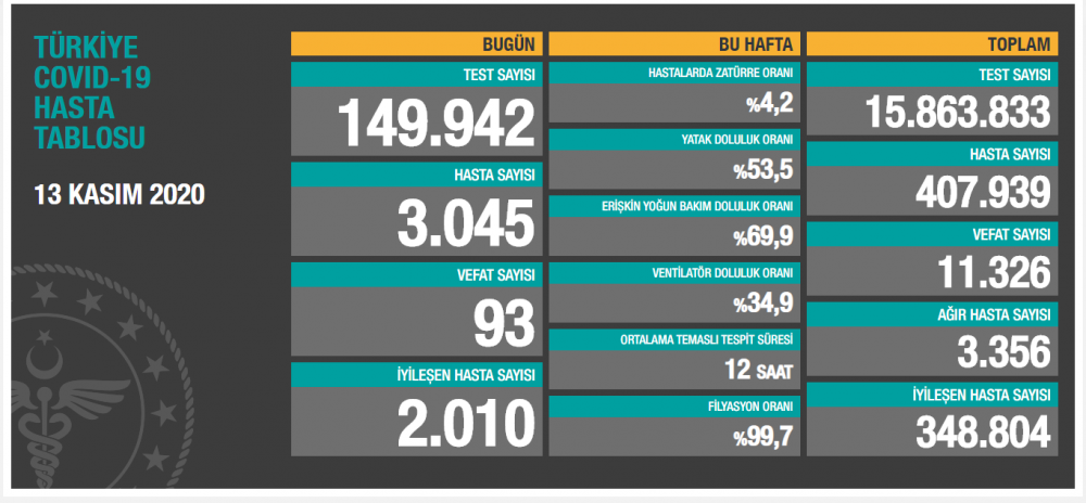 İşte 13 Kasım 2020 güncel Koronavirüs tablosu;