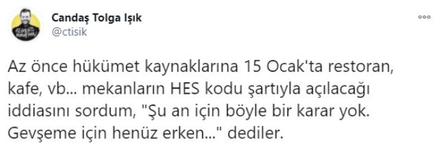 Konuya ilişkin açıklama pandemi döneminde hükümetten bilgi alarak duyuran ünlü gazeteci Candaş Tolga Işık'tan geldi. Işık, hükümet yetkililerine; "15 Ocak'ta restoran ve kafeler açılacak mı?" diye sorduğunu, aldığı cevabın olumsuz olduğunu söyledi. Hükümet yetkilileri Candaş Tolga Işık'a; "Henüz erken" dedi.
