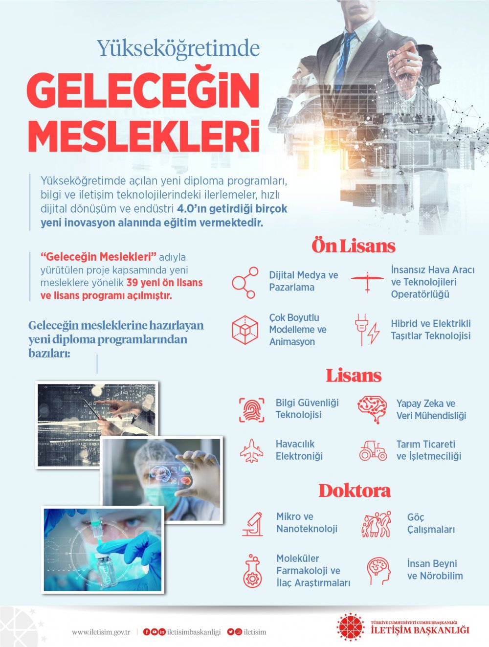 Cumhurbaşkanlığı tarafından verilen bilgilere göre 39 yeni bölümde ağırlık 'geleceğin meslekleri'nde. Dijital dünyadan yapay zekaya, savunma sanayinden hibrit teknolojisine kadar geniş yelpazede eğitim verecek bu 39 yeni bölüm 2021 YKS tercihlerinde seçilebilir durumda olacak.