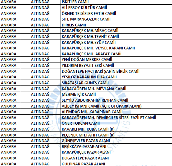 Ankara'da 29 Mayıs'ta açılacak camiler ve Cuma Namazı kılınacak yerler listesi şu şekilde açıklandı;