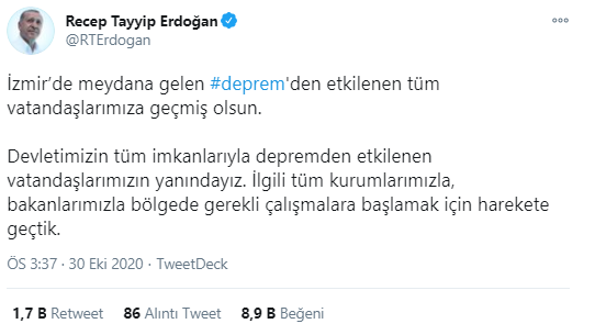 Türkiye Cumhuriyeti Cumhurbaşkanı Recep Tayyip Erdoğan İzmir Depremi ile ilgili bir mesaj paylaştı. Cumhurbaşkanı Erdoğan, İzmir'deki vatandaşlara geçmiş olsun dileklerini iletirken, gereken çalışmaların başladığını belirtti.