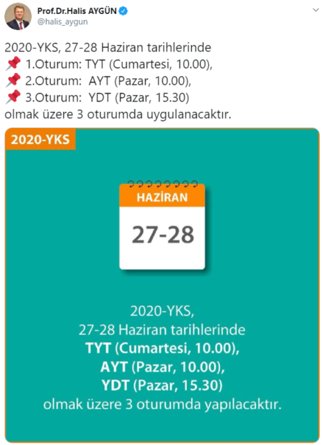 27 Haziran 2020 Cumartesi ve 28 Haziran 2020 Pazar günleri Türkiye'nin 81 ilinde eş zamanlı olarak yapılacak ve üniversitelerin 2 veya 4 yıllık bölümlerine girmek isteyen adayların katılacağı Yükseköğretim Kurumları Sınavı (YKS) için geri sayım başladı. 2.5 milyon adayın gireceği sınava Covid-19 nedeniyle tedbirler damga vuracak. Bulaşma riski nedeniyle YKS öncesi ve sonrasında sokağa çıkma yasağı 27-28 Haziran 2020 tarihlerinde geçici olarak 81 ilimizde belirli saatler arasında uygulanacak.