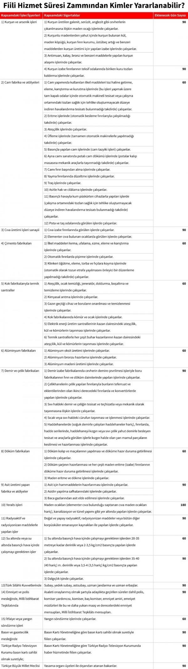 45 iş kolundaki erken emeklilik şansı, Fiili Hizmet Süresi Zammı ile çalıştıkları yıllar için hizmet sürelerine ekleme yapılıp, işe başlama tarihleri öne çıkarak sağlanıyor. Belirli mesleklerde gelen bu hak ile çalışanlar her yıl 60-90 veya 180 güne kadar gün kazanabiliyor.