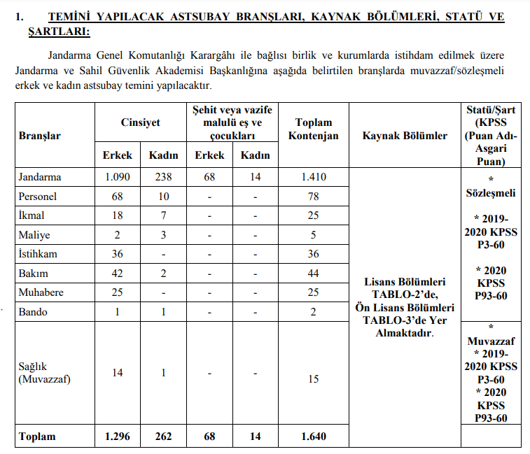 Konu ile ilgili Jandarma bünyesinden duyuru gelmiş durumda. 1640 kişi alımı olacak. Kadrolar şöyle duyuruldu;