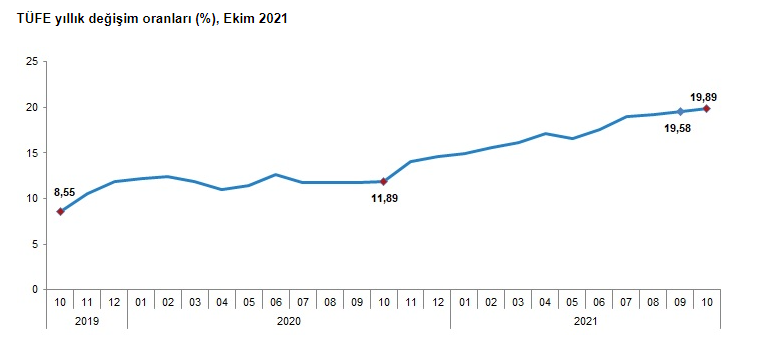 TÜFE'de (2003=100) 2021 yılı Ekim ayında bir önceki aya göre %2,39, bir önceki yılın Aralık ayına göre %15,75, bir önceki yılın aynı ayına göre %19,89 ve on iki aylık ortalamalara göre %17,09 artış gerçekleşti.