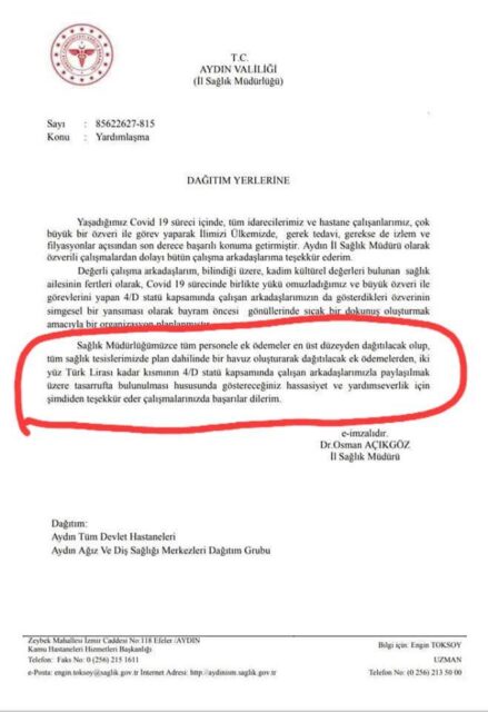 Aydın Valiliği tarafından merkez ve taşra sağlık kurumlarına gönderilen yazıya göre, il genelinde sağlık personeline ödeme en üst limitten yapılacakken, 4/D sürekli işçi olarak çalışan personele de 200 lira ek ödeme yapılması kararlaştırıldı.